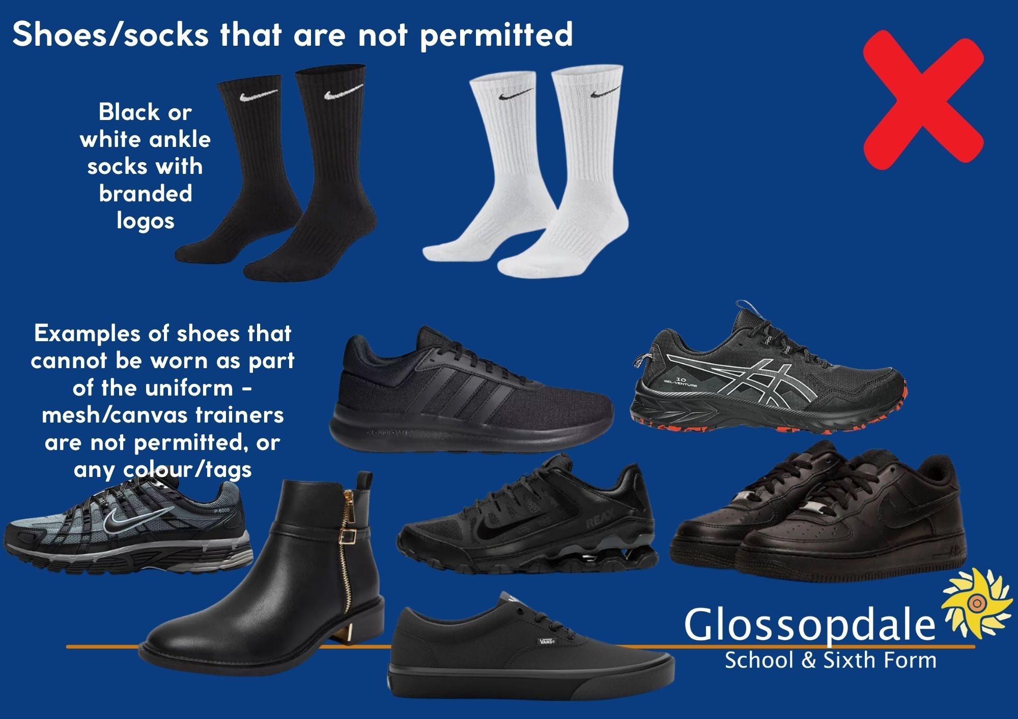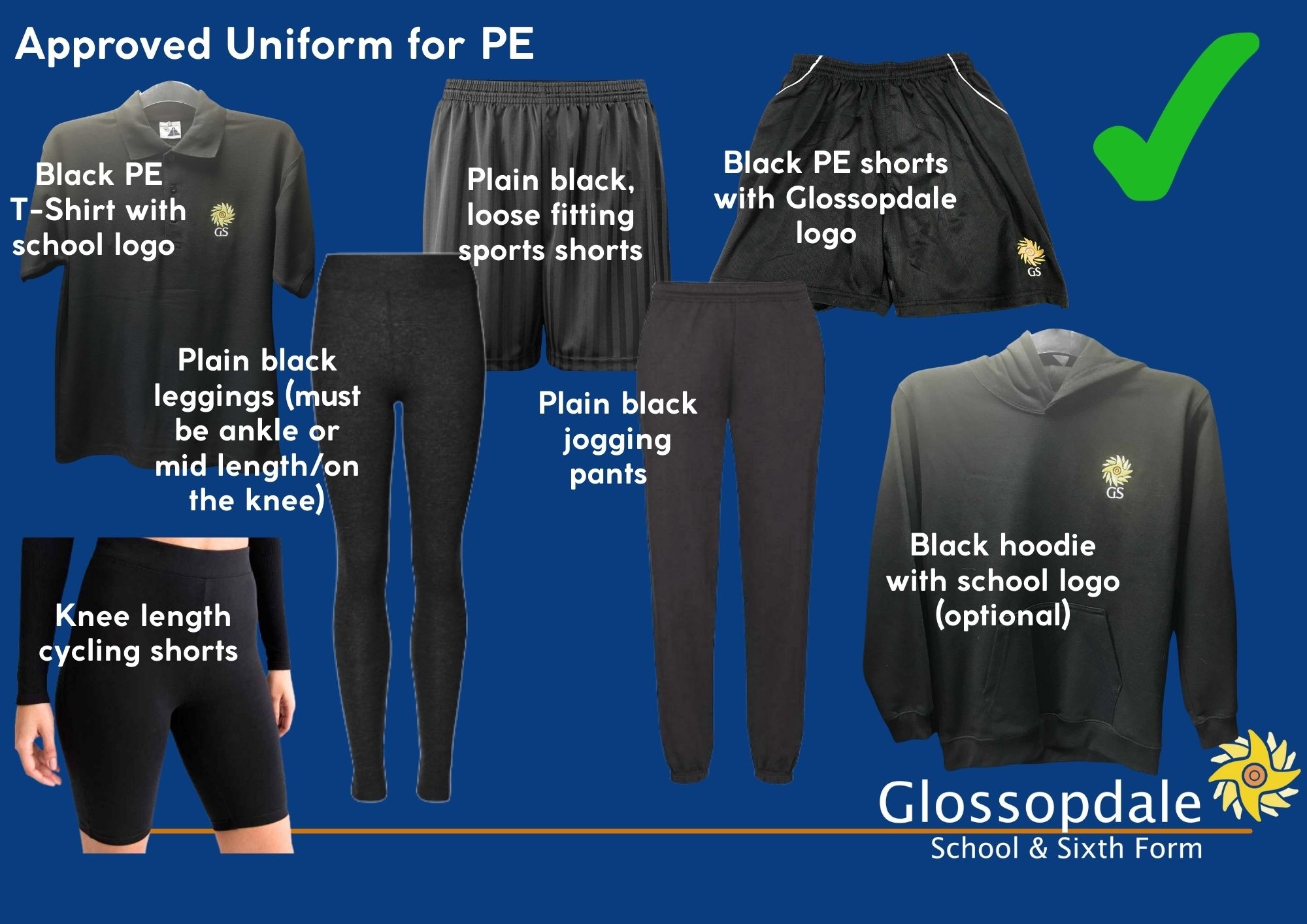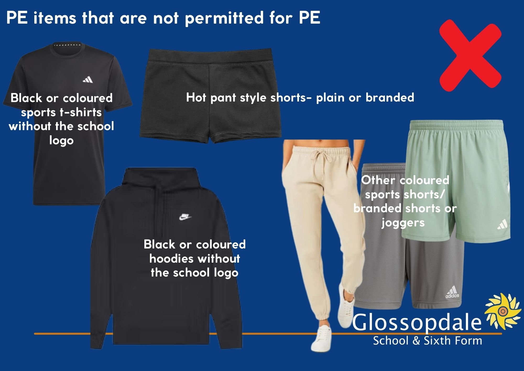 Images of approved and not permitted uniform items for school and PE